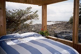 Waldhütte in einer traumhaften und unberührten Naturlandschaft auf Vancouver Island am Pazifischen Ozean.